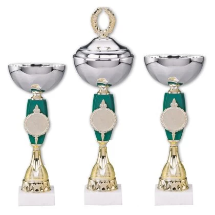 Schöne Pokalserie mit silberner Schale und royal grünem Zwischenstück.