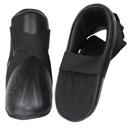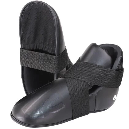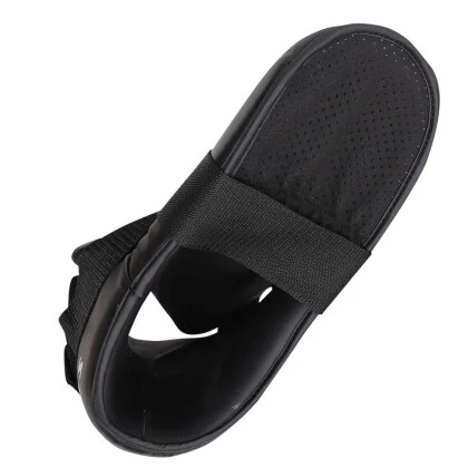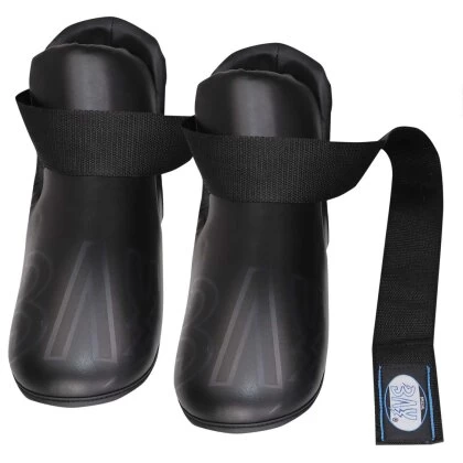 Anstatt der üblichen Zehenschlaufen hat dieses Modell eine „Zehentasche“ die den Schützer sicher am Fuß hält und besonders bequem ist.