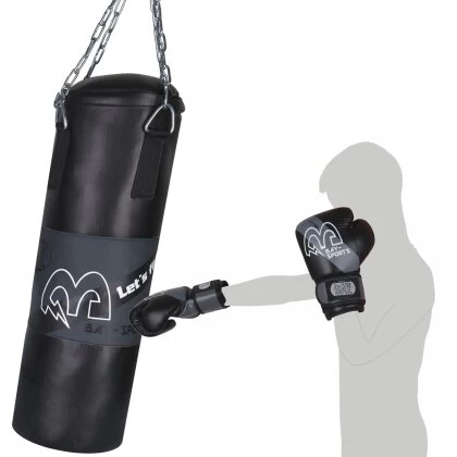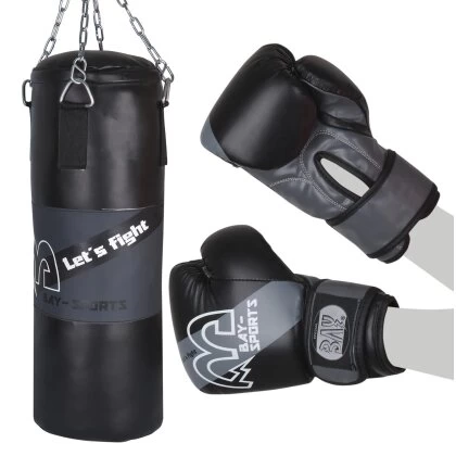 SANDSACK – BOXSACK – 80 cm mit Stahl- KETTEN – fertig gefüllt + PU LEDER – BOXHANDSCHUHE S/M
