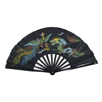 Chinesischer Fächer aus Bambusholz mit schwarzer Stoffbespannung, bedruckt mit traditionell chinesischem Motiv.