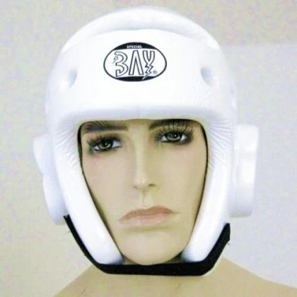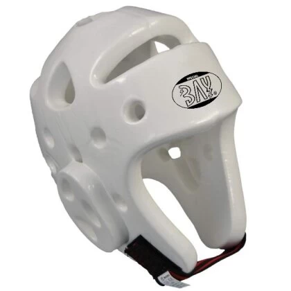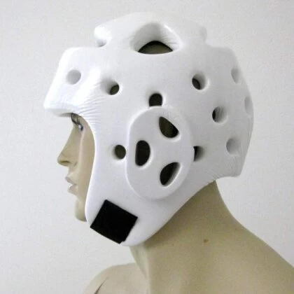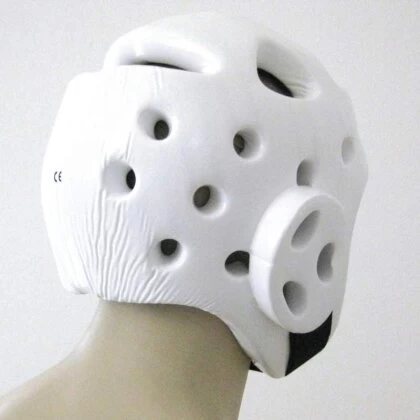 Der Kopfschützer ist angelehnt an die Bestimmungen der World Taekwondo Federation / WTF in den Farben rot und blau.