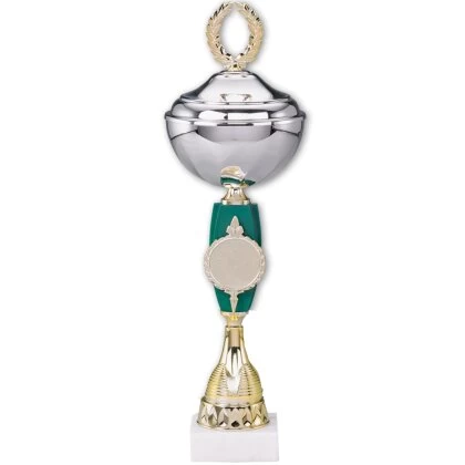 Schöne Pokalserie mit silberner Schale und royal grünem Zwischenstück.